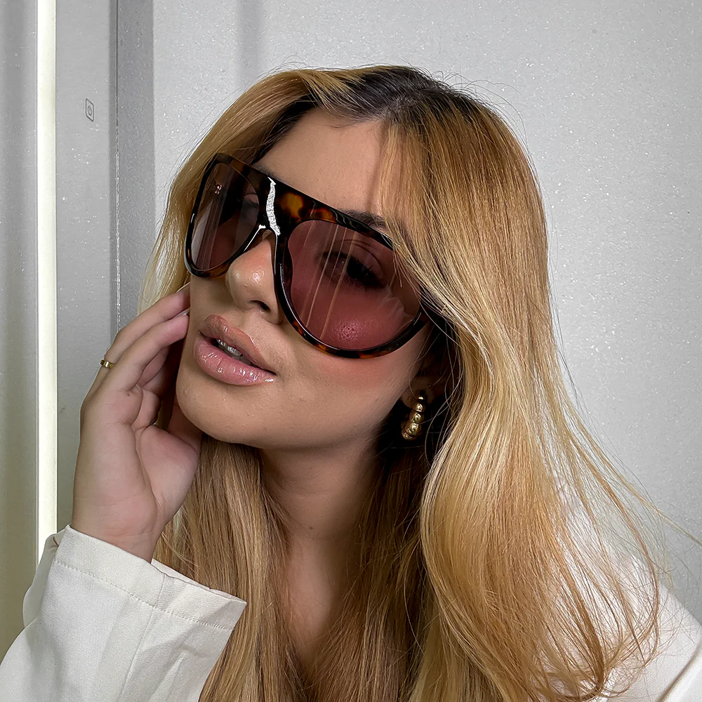 As lentes em tom rosado adicionam uma aura contemporânea ao visual, refletindo estilo e sensibilidade artística — perfeito para quem gosta de peças com assinatura e identidade própria.