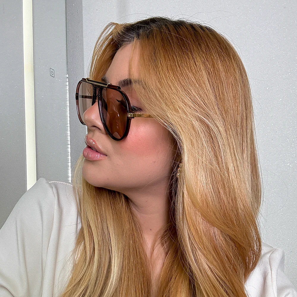 As lentes marrom suave trazem profundidade e elegância natural — ideal para quem busca um aviador com identidade única.